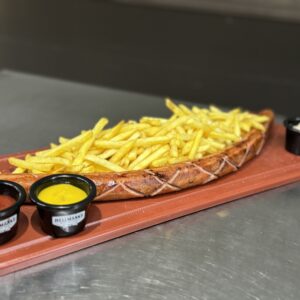 salchicha, papas, ketchup, mostaza y alioli