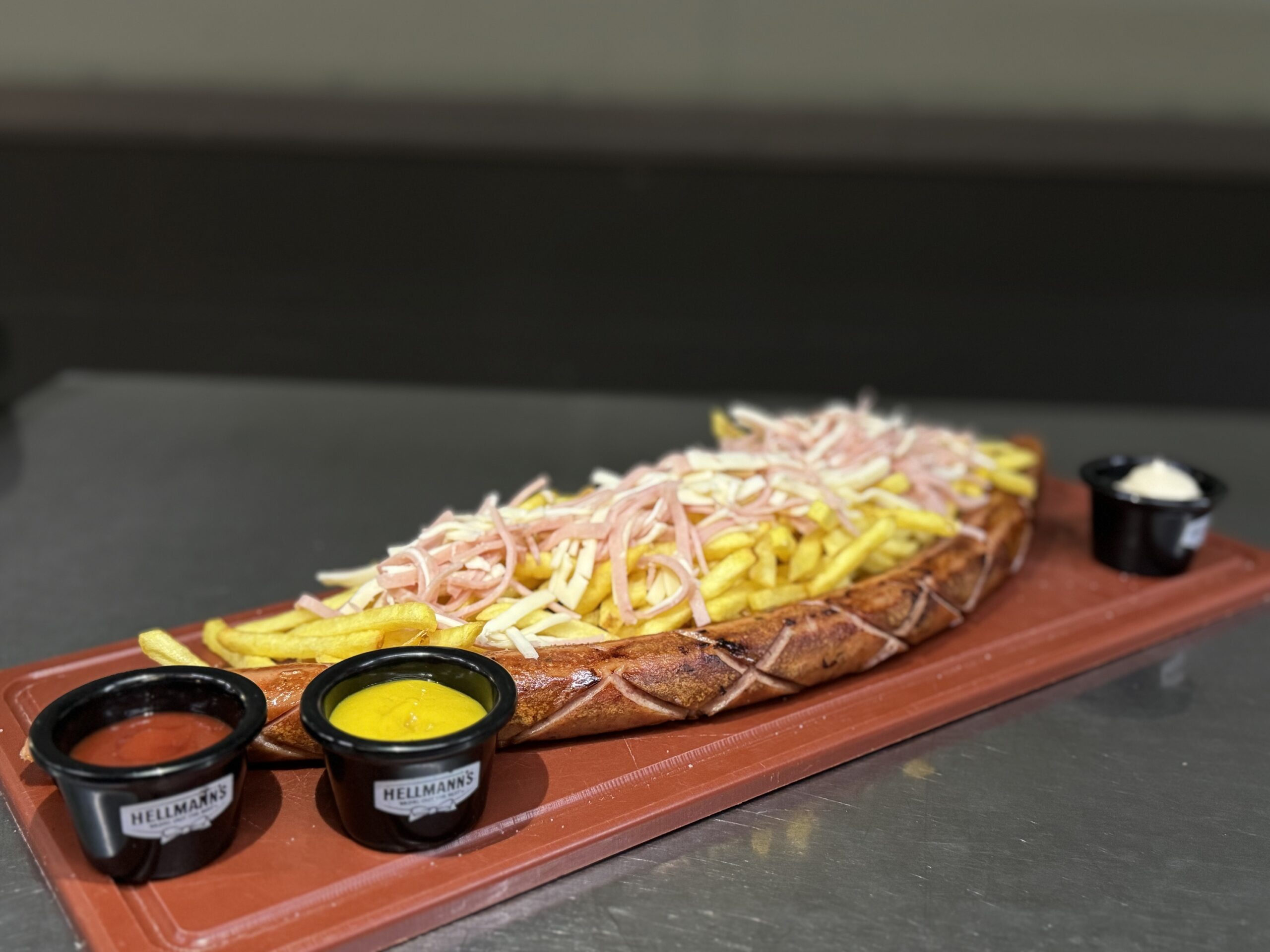 salchicha, papas jamón, queso ketchup, mostaza y alioli