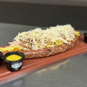 salchicha, papas , jamon, queso, pollo, mechada,—- ketchup, mostaza y alioli